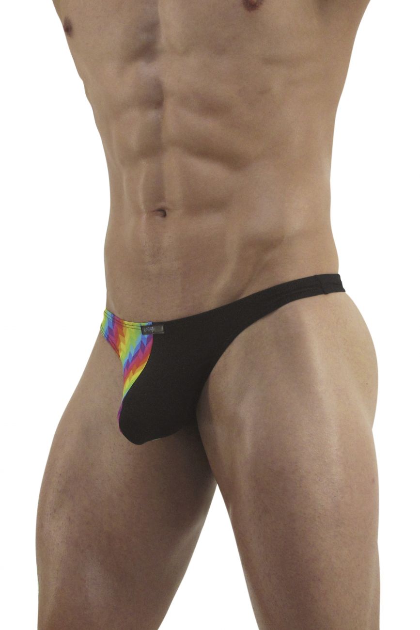 Minimal coverage is provided in this thong fitted with the X3D pouch. Soft microfiber even covers the narrow waistband. 100% ergonomic design 3-dimensional pouch in X3D design manufactured in microfiber concealed narrow waistband. A touch of color added in rainbow shades on one side on the front of the piece